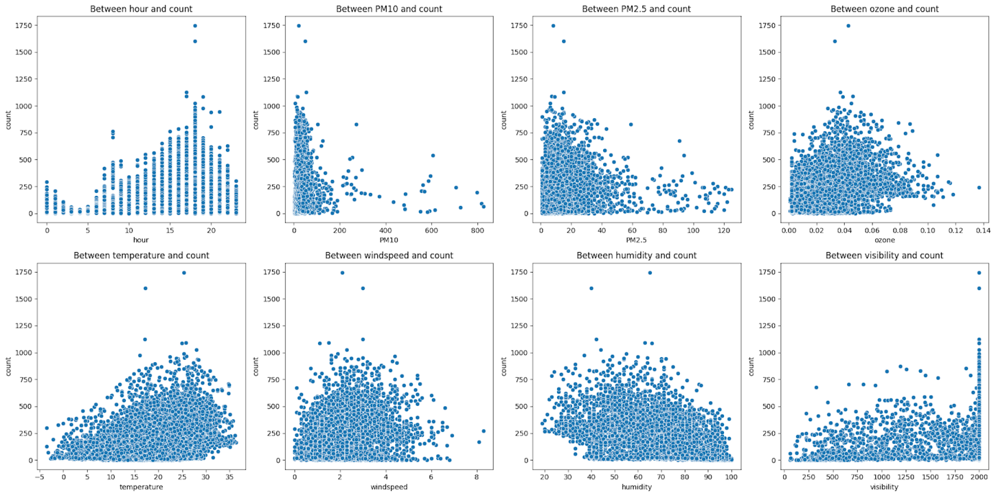 또한, 오존 수치, 온도, 풍속, 가시성과 같이 좋은 날씨 조건이 따릉이 이용 증가하고 반면, 습도가 높을 때는 대여량이 감소하는 경향을 보이는 것을 확인하였다. 이를 통해 날씨 예보와 환경 상태를 모니터링하여 이용자에게 적절한 시간에 대여를 권장하는 마케팅 전략을 수립해야 한다고 결론을 내렸다.