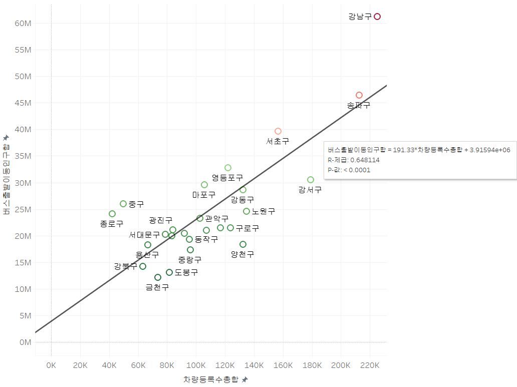 가설2는 서울 자치구별 차량 등록 수 데이터를 따로 찾아서 자치구별 개인 자동차만 파악하기 위해 영업용 차 등을 제외한 승용차 등록 대수를 파악하였다. 그리고 버스 이용량을 버스 출발 이동 인구로 확인한 이유는 유출입 등 고려해야 할 요소가 많아 버스 이용이 출발되는 인구로 버스 이용량을 확인하기로 하였다.