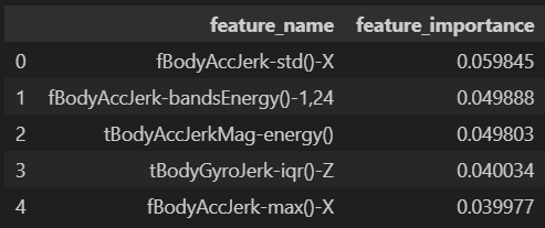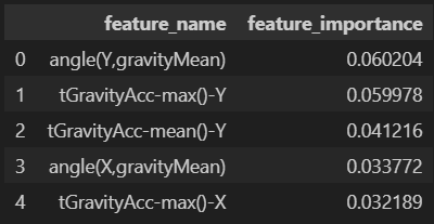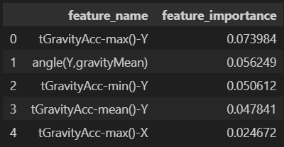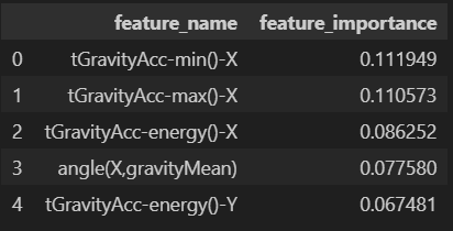 그 다음, 정적행동과 동적행동으로 구분하는데 중요한 변수를 찾기 위해 feature 변수들에 대한 분석을 하였다. 행동을 구분하는 feature변수는 총 561개 있는데 너무 많으므로 randomforest 모델링을 이용해 중요한 변수 상위 5개만 선정하였다.