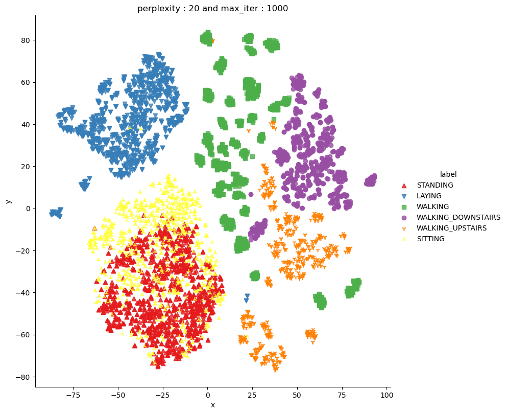 T-SNE의 결과를 통해 LAYING변수의 경우, 센서가 지표면과 평평한 상태에서 움직이지 않는 경향으로 따로 분류가된다는 것을 알 수 있다. STANDING 변수와 SITTING변수의 경우, 센서가 움직이지 않는 상태에서 서있기와 앉기는 단순 높낮이의 차이만 보이기에 비슷하게 분류가 된다는 것을 알 수 있다. WALKING, WALKING_DOWNSTAIRS, WALKING_UPSTAIRS의 경우, 동적인 활동으로 지표면으로 부터의 높낮이에 따라 차이가 나기 때문에 크게 비교할 수가 없기에 같이 분류가 된다는 것을 확인할 수 있다.
