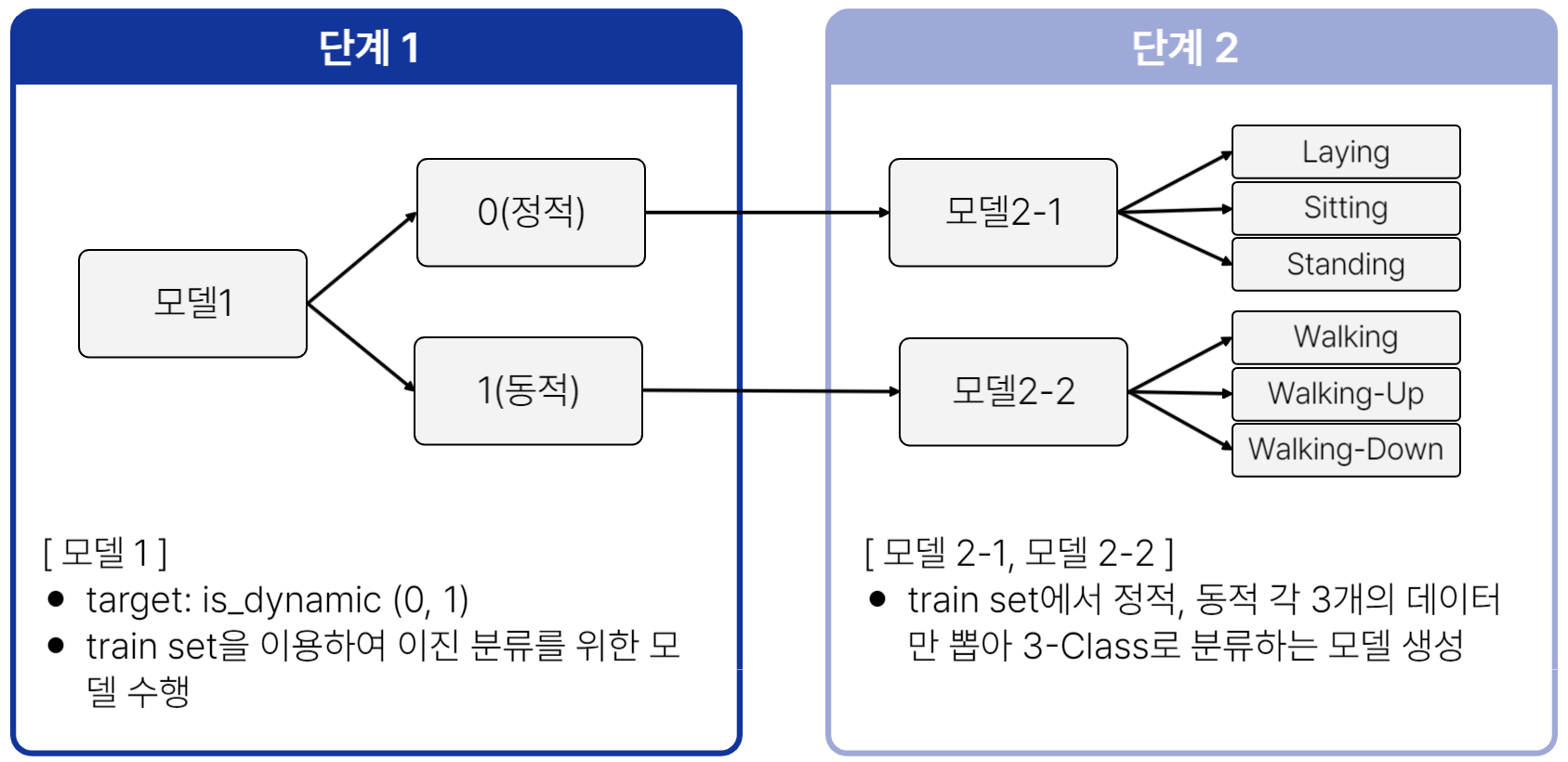 is_dynamic변수를 추가하여 정적행동(STANDING, SITTING, LAYING)이면 0, 동적행동(WALKING, WALKING_DOWNSTAIRS, WALKING_UPSTAIRS)이면 1로 구분하였다.