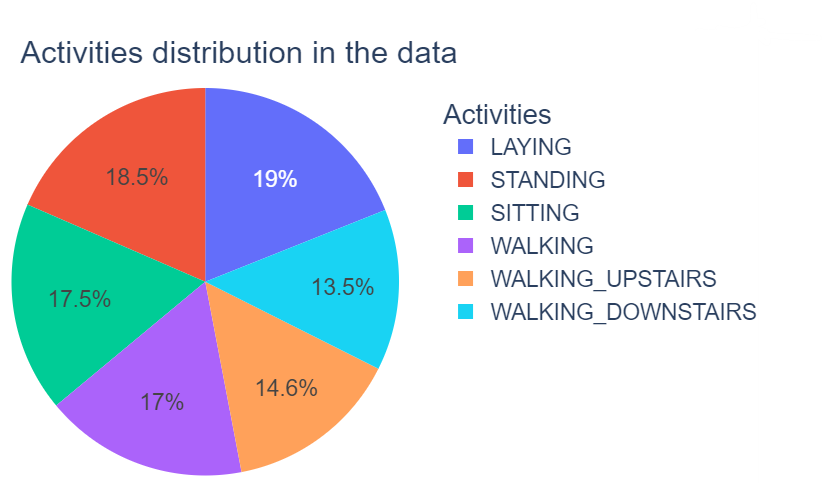 data프레임에는 Active라는 변수로 사람의 행동에 대해 6가지로 분류되어 있다. 먼저 행동변수인 6개의 변수들의 분포를 막대그래프, 원그래프, 군집화 등 다양한 시각화 방법으로 살펴보았다.