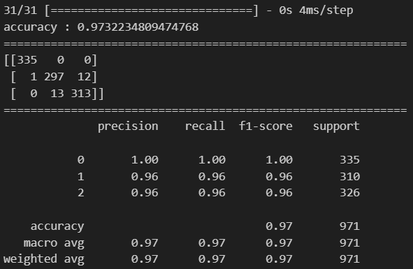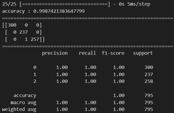 위와 같이 진행한 이유는 상세 분류 전에 변수들을 라벨링을 통해 숫자형으로 변환되었다. 이로 인해 정적행동은 0, 1, 2로 동적행동은 3, 4, 5로 변환되었다. 그리고 상세 분류를 할 때는정적행동, 동적행동 상세 분류 모델 모두 0, 1, 2로 예측값이 주어진다. 정적행동은 0, 1, 2의 예측값과 실제값이 동일하므로 비교가 가능하지만, 동적행동은 실제값은 3, 4, 5인데 예측값이 0, 1, 2이므로 비교할 수가 없다. 따라서 예측값에 +3을 해주어 비교를 위해 값을 일치시켜준 것이다.
