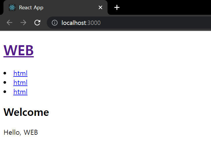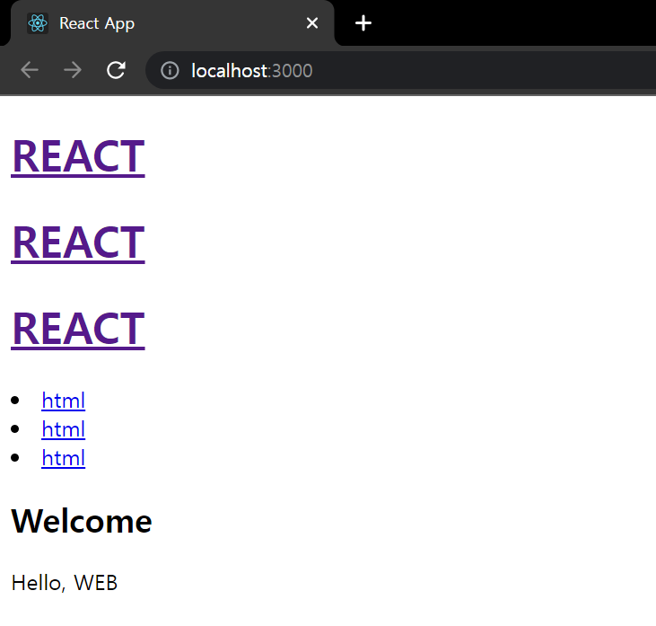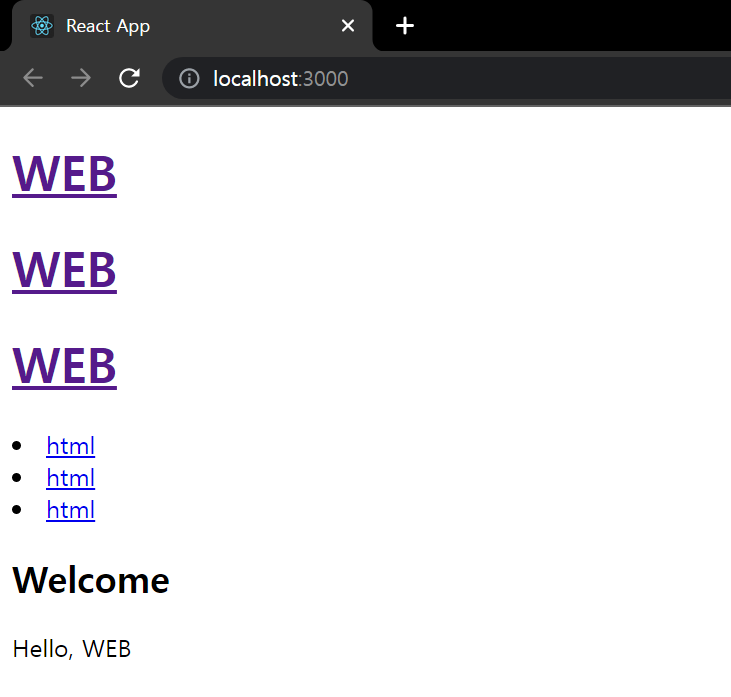 <Header></Header>를 11행 밑 12행, 13행 2개 정도 추가하고 5행에 WEB을 REACT로 바꾸어 결과를 확인해본다.