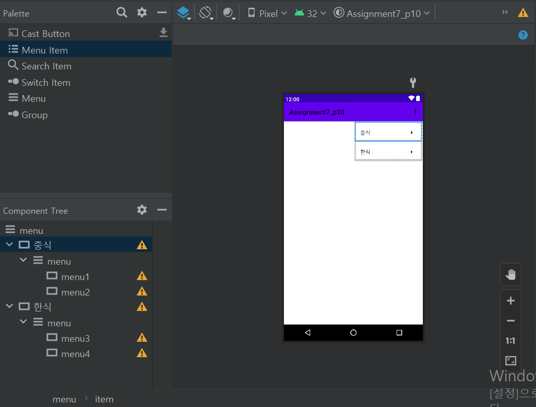 Design에서 Palette에 있는 Menu를 Component Tree에 드래그하는 것과 같다.