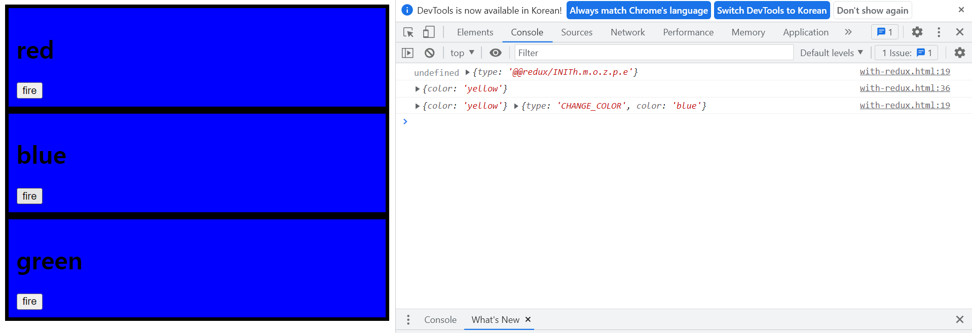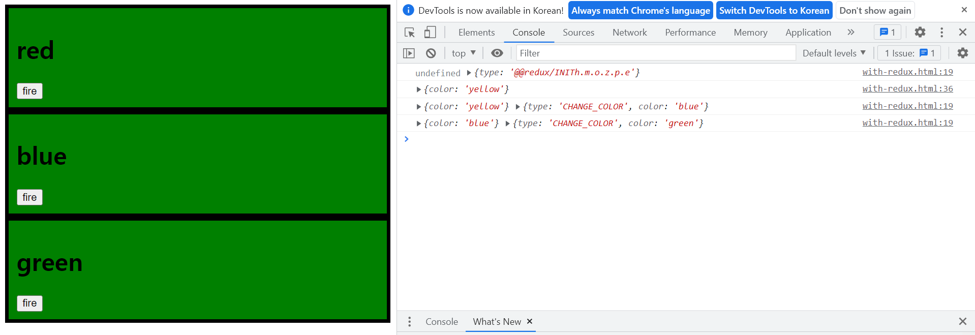 store.dispatch({type:'CHANGE_COLOR', color:'blue'}); //store에 dispatch 함수를 호출해 type 객체를 주는데 이것을 반드시 있어야 한다.