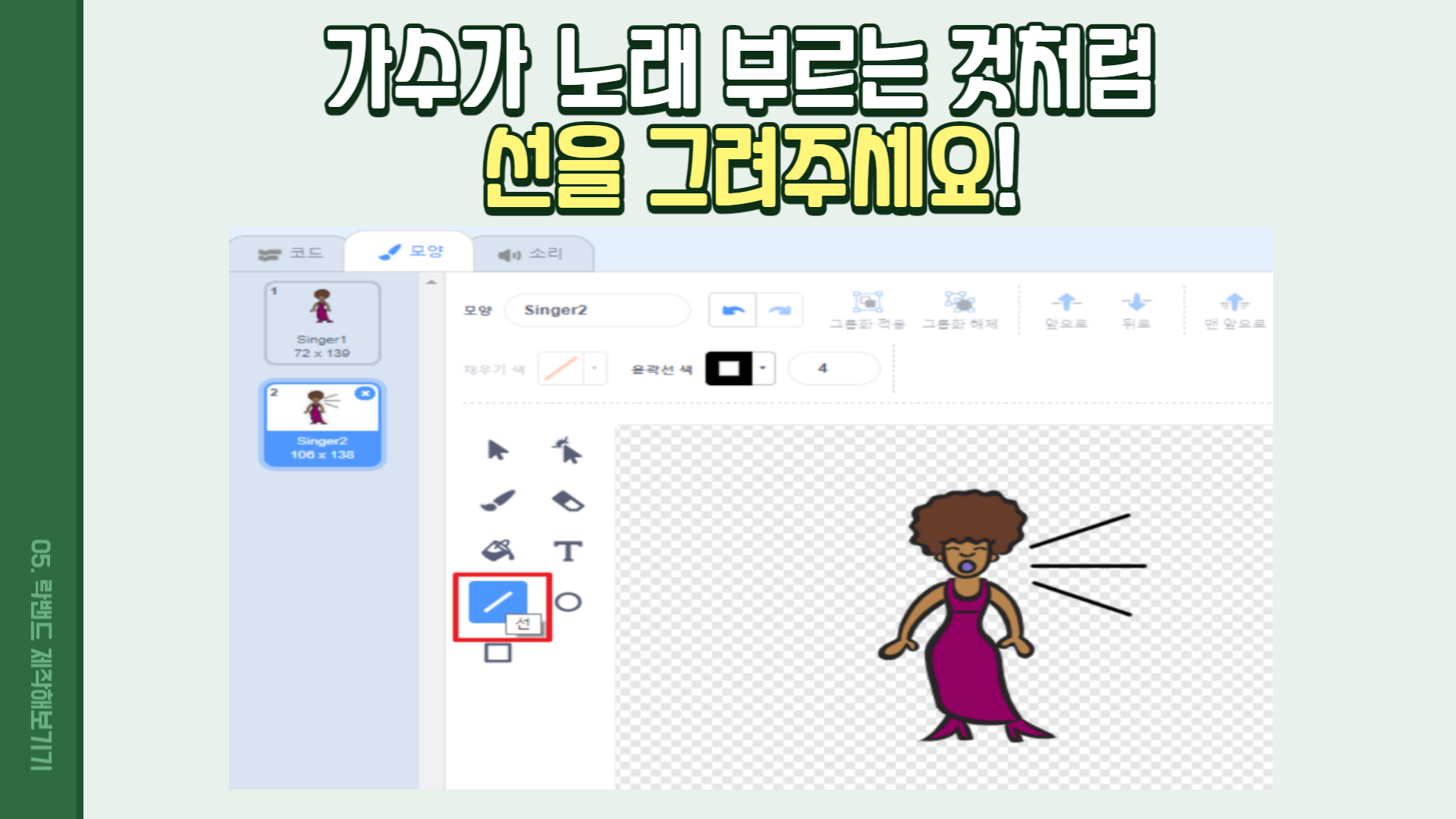그리고 가수 스프라이트가 노래를 부르는 모습을 표현해주기 위해 스프라이트가 변화하는 방법을 가르쳐주었다.