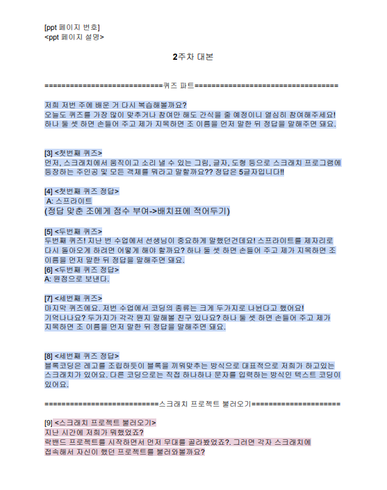 지난 시간에 스크래치의 영역들에 대해서 알아봤었는데 표시된 부분의 영역 이름은 무엇인지 등으로 스크래치 구성을 자연스럽게 익힐 수 있도록 하였다.