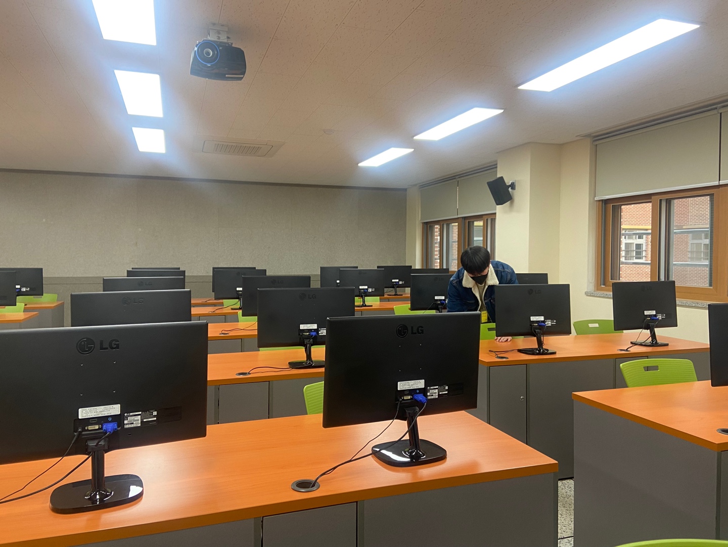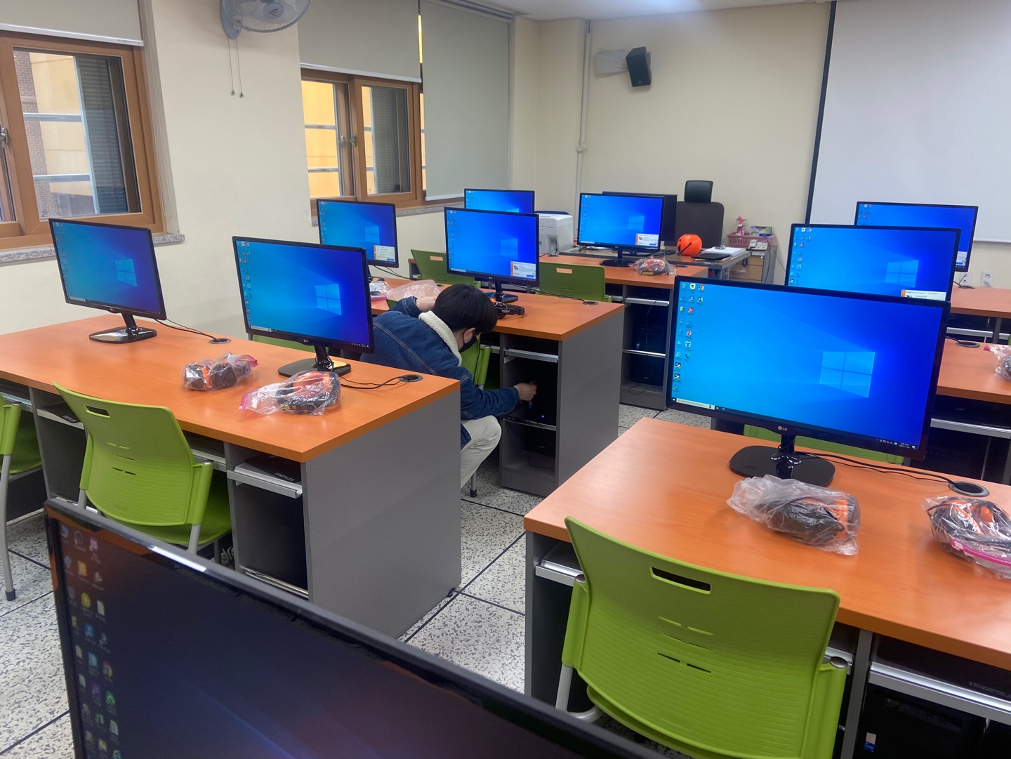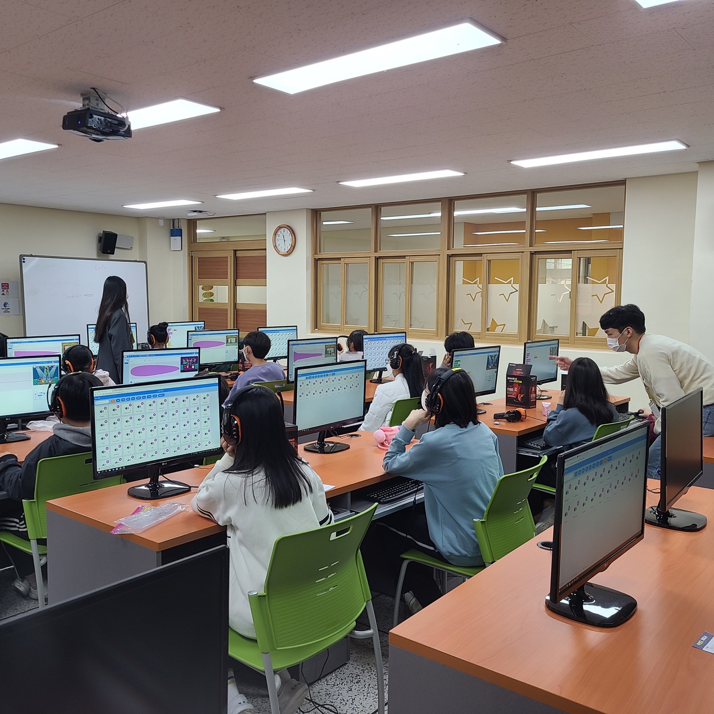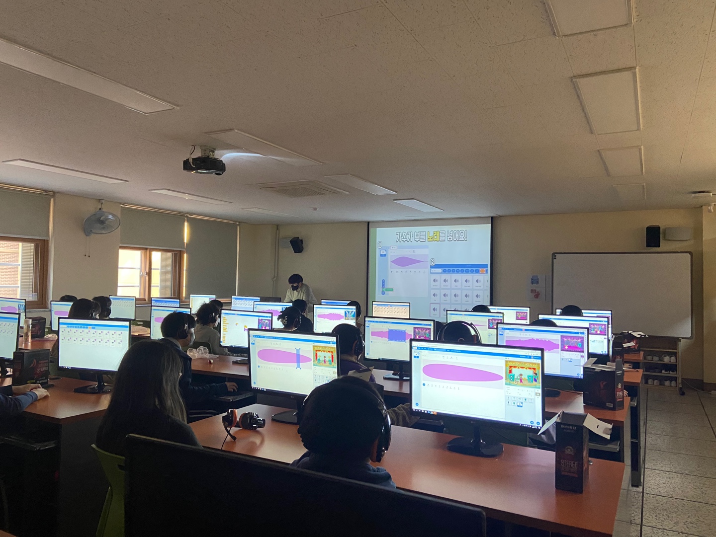 컴퓨터실에서 수업하는 사람들은 컴퓨터실에서 빠른 수업 진행을 위해 음악을 들을 수 있도록 개인 헤드셋과 컴퓨터를 미리 셋팅해놨다.