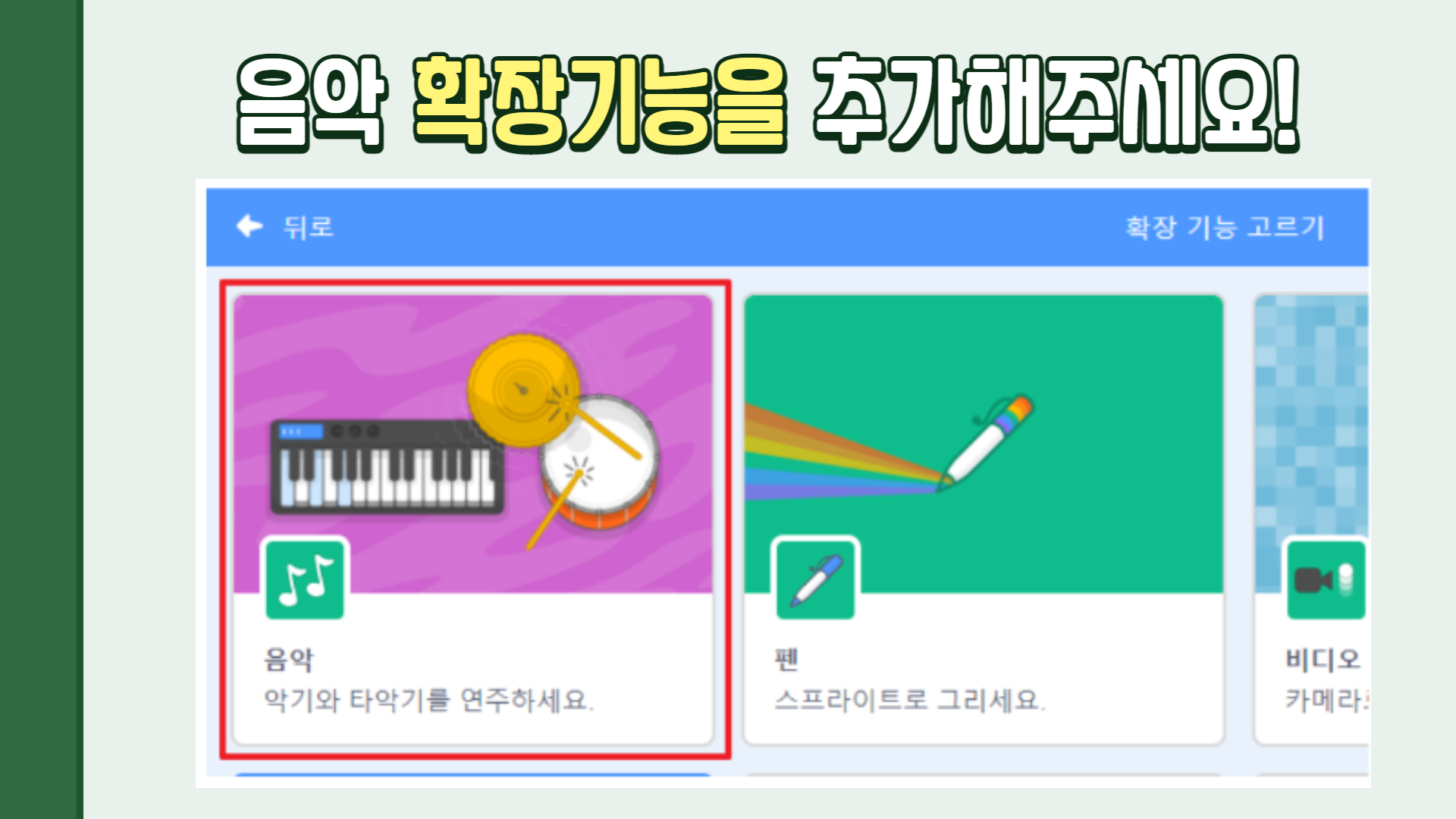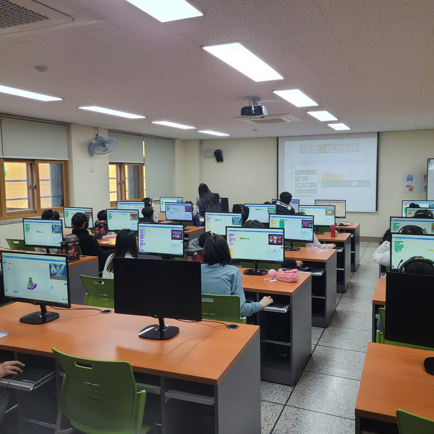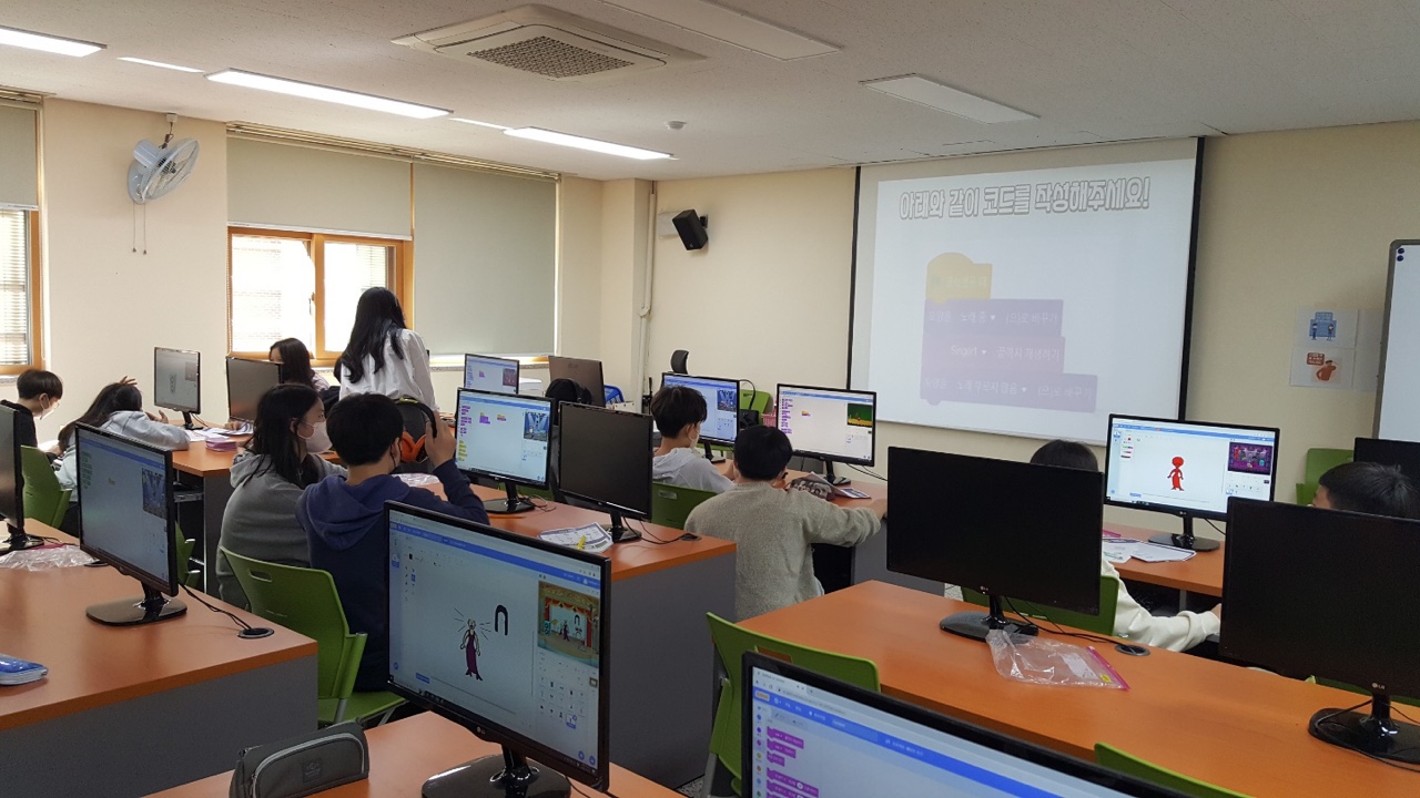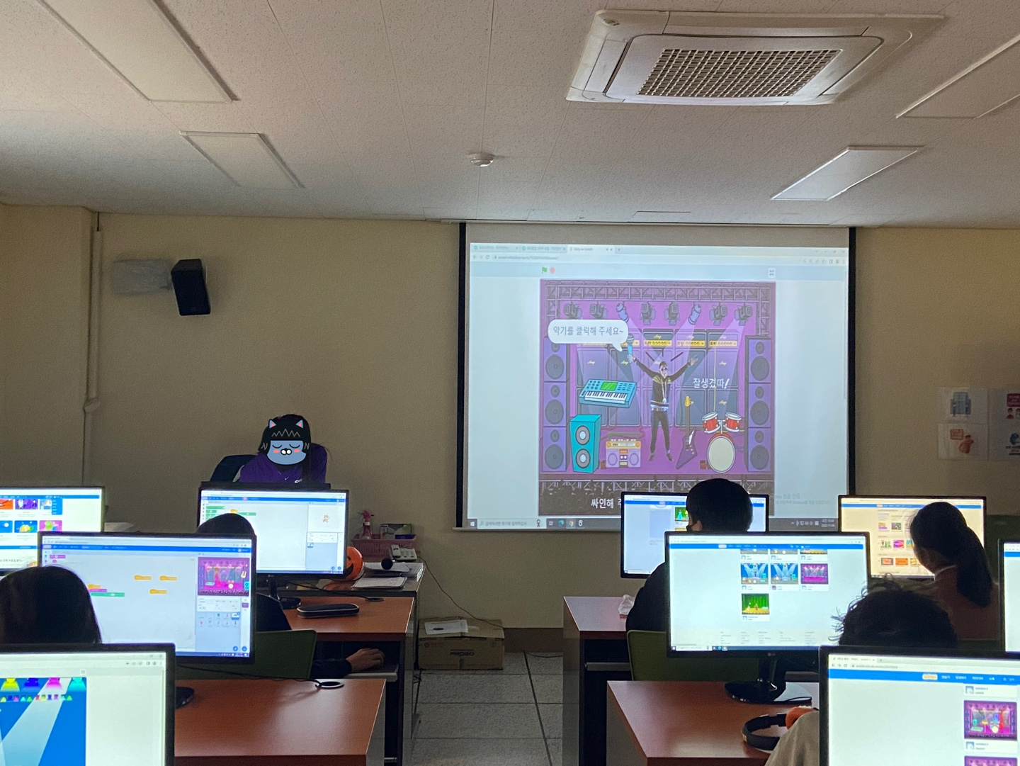 무대는 저번 시간에 미리 골라놓았어서 바로 자신이 원하는 악기, 가수 스프라이트, 그리고 음악 추가하는 방법을 먼저 가르쳐주어 자신들의 무대를 구성하도록 하였다.