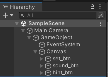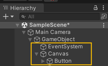 그럼 Canvas안에 버튼이 생성되고, EventSystem이 자동으로 생성된다. 이때, EventSystem은 절대 삭제하면 안 된다.