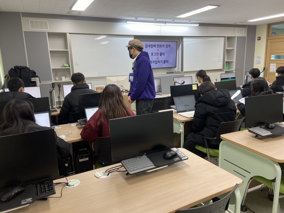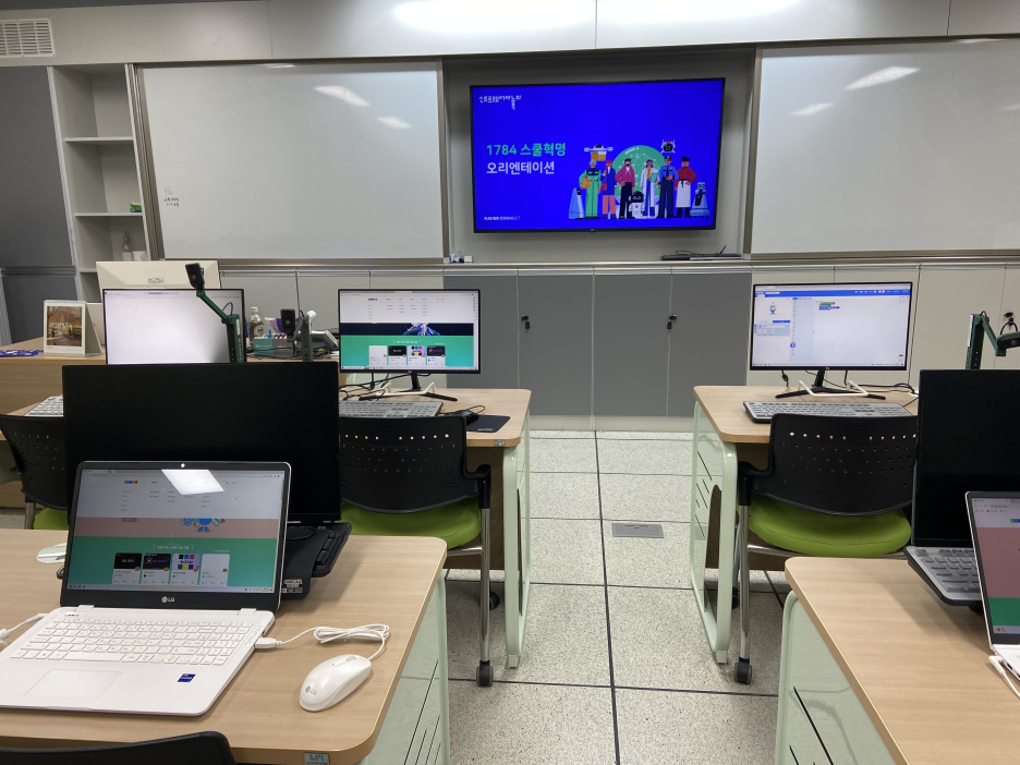 먼저 오프닝 영상 시청 후 자기소개, 수업 중 지켜야 할 규칙 안내, 네이버 1784에 대한 영상 시청과 간단한 설명, 시청한 영상을 바탕으로 간단한 퀴즈, 엔트리 로그인 해보기, 사전 설문조사를 실시하였다. 설문조사를 할 때, 엔트리 커뮤니티를 이용하니까 학생들이 사이트 접속을 훨씬 편리해했던 것 같다.