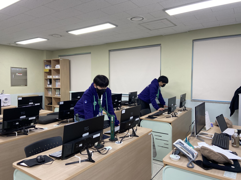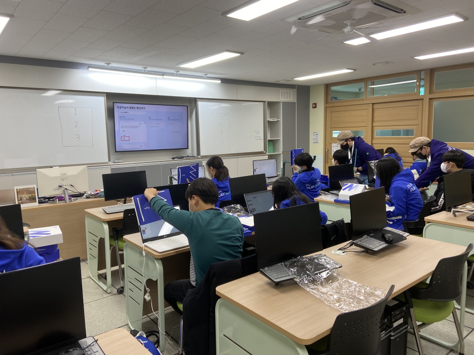 학생들이 수업 때 사용할 웹캠과 마이크 설치, 컴퓨터 전원과 노트북 충전기 연결을 다 해놓았다. 원래라면 1784스쿨혁명 포스터와 현수막도 교실에 설치해야 하는데 우리는 다음날에 올 예정이라서 설치를 못하였다.