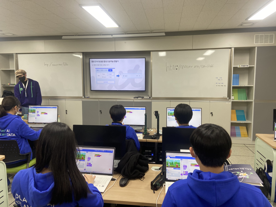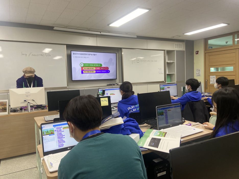 인공지능의 악용가능성에 대한 의미, 생성모델과 생성모델이 생성되는 방법, 생성모델이 사용된 사례 영상을 시청하였다.생성모델과 생성모델이 생성되는 방법에 대해 학생들에게 설명할 때 생성적 적대 신경망과 같은 어려운 단어가 많이 나왔다. 그래서 '적대적'이라는 단어의 뜻을 추가로 설명을 같이 해주는 등 학생들이 최대한 이해하기 쉽도록 기존의 대본을 수정하여 수업을 준비하길 잘했다는 생각이 들었다. 4차시 엔트리 실습에서는 음성 인식 및 음성 합성 프로그램을 만들었다.