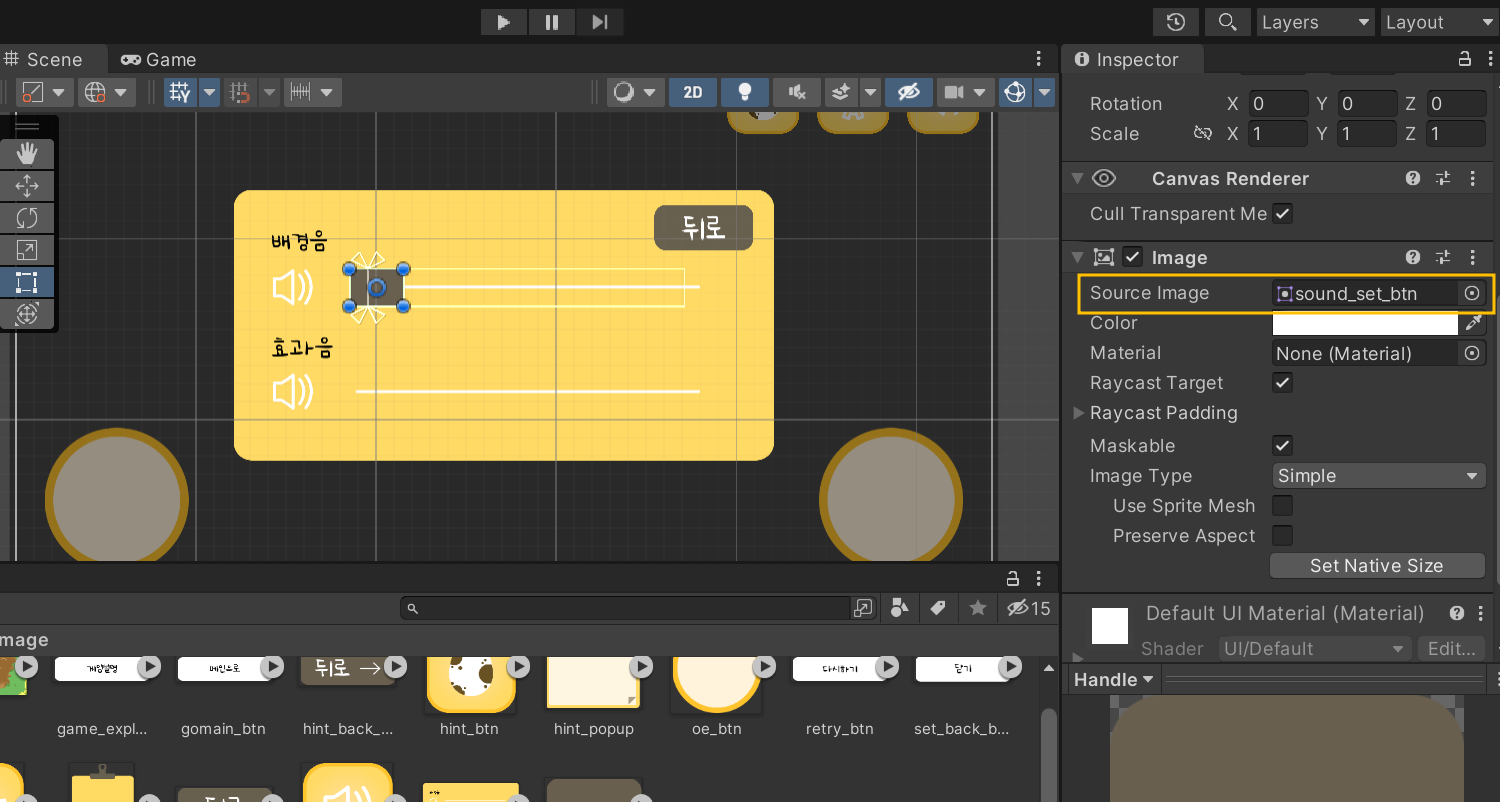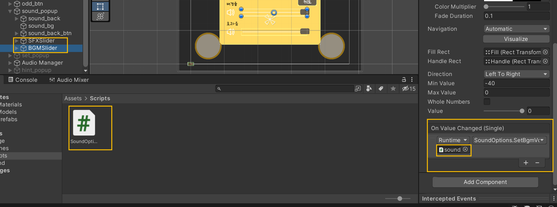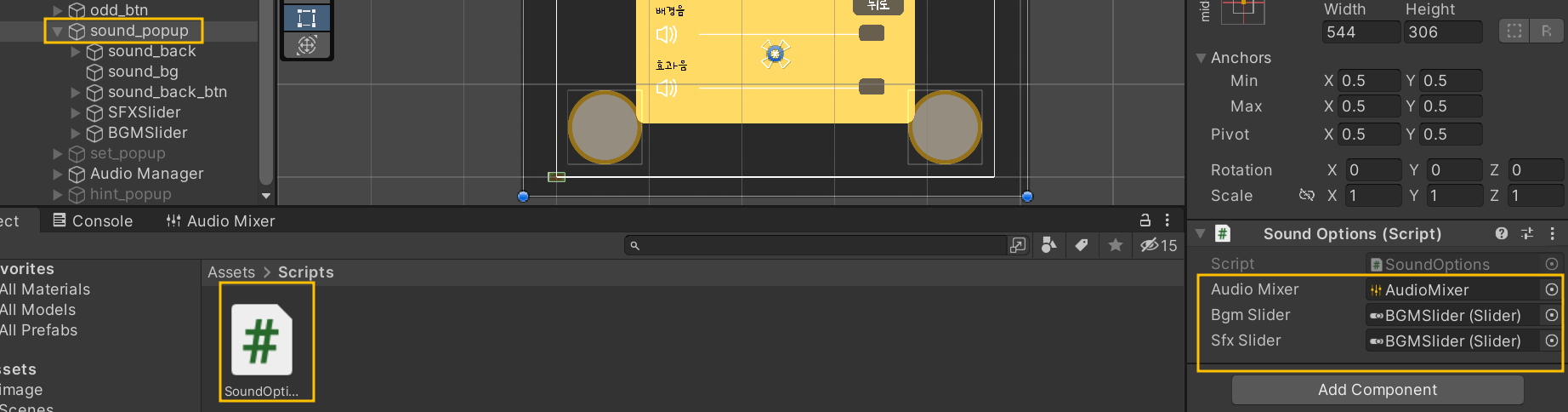 하이어라키에서 sound_popup 클릭 후 SoundOptions 스크립트를 인스펙터에 드래그한다. 그리고 sound폴더에 있는 Audio Mixer와 해당하는 슬라이더를 드래그해준다.