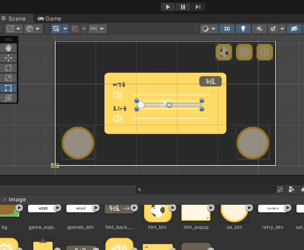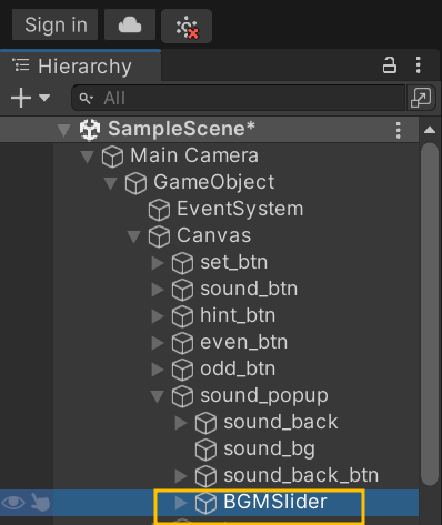 slider를 원하는 위치에 놓고 크기를 조절한다. 그 다음 BGMSlider를 클릭하면 세 개의 폴더가 나온다.