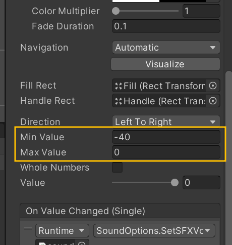 마지막으로 각 BGM, SFX 슬라이더를 클릭하고 인스펙터를 보면 Min Value와 Max Value가 나온다. 이는 볼륨의 최소 크기과 최대크기이다. Max Value는 0이 넘어가면 음질이 많이 깨지게 된다.
