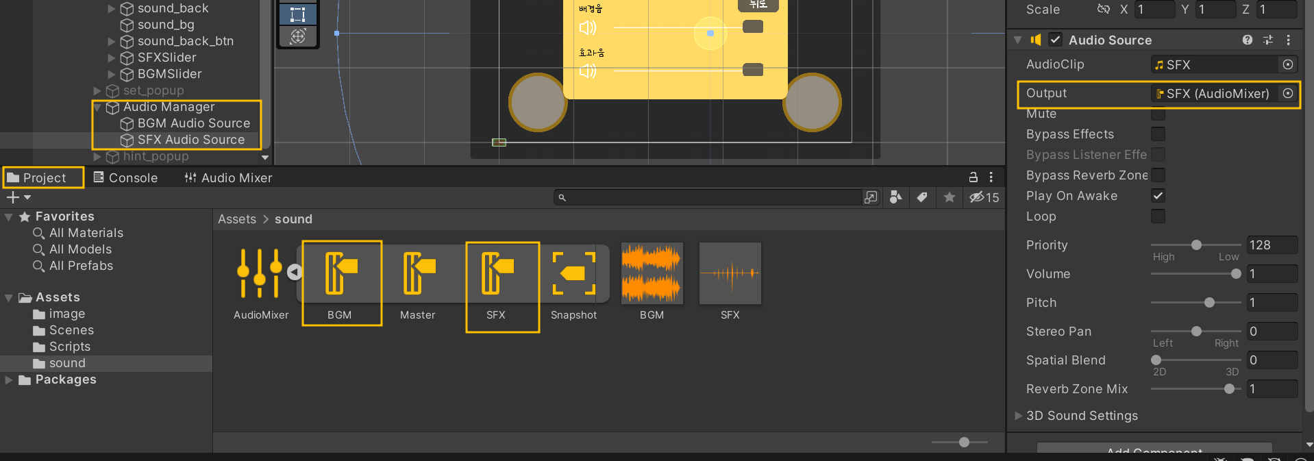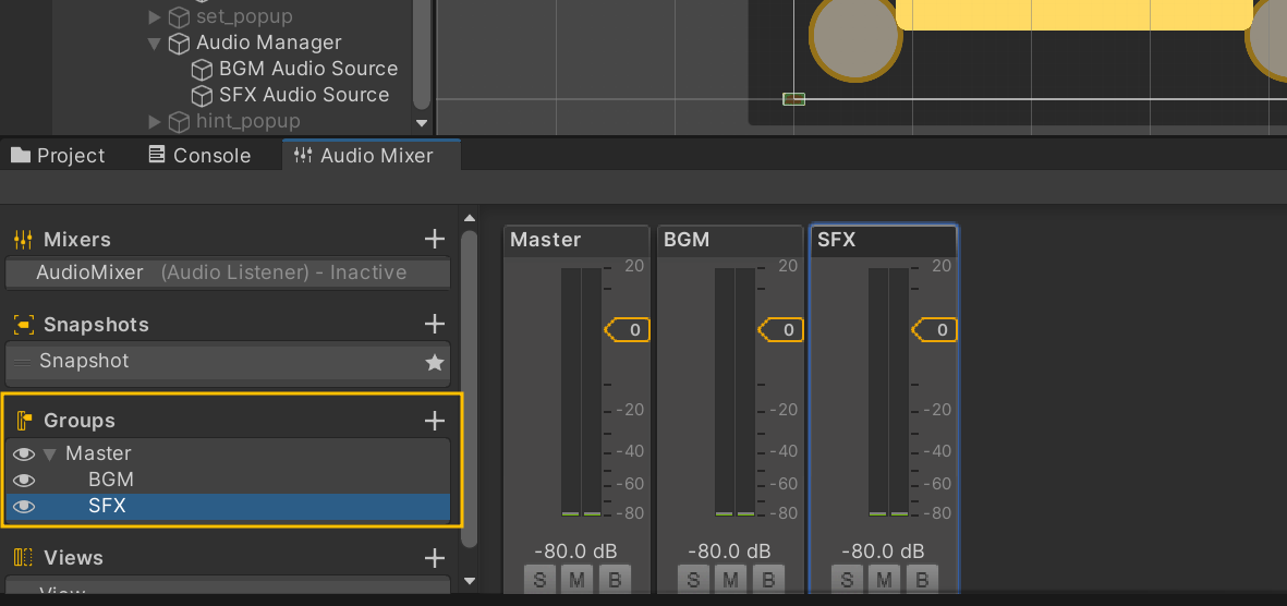 그리고 Project를 눌러 Audio Mixer를 펼친다. 그 다음, BGM Audio Source와 SFX Audio Source를 각 클릭해 Output에 각 mixer를 드래그 해준다.