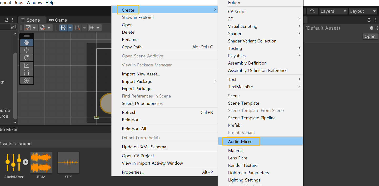 그리고 Assets의 sound 폴더에 마우스 우클릭 > Create > Audio Mixer를 클릭한다.