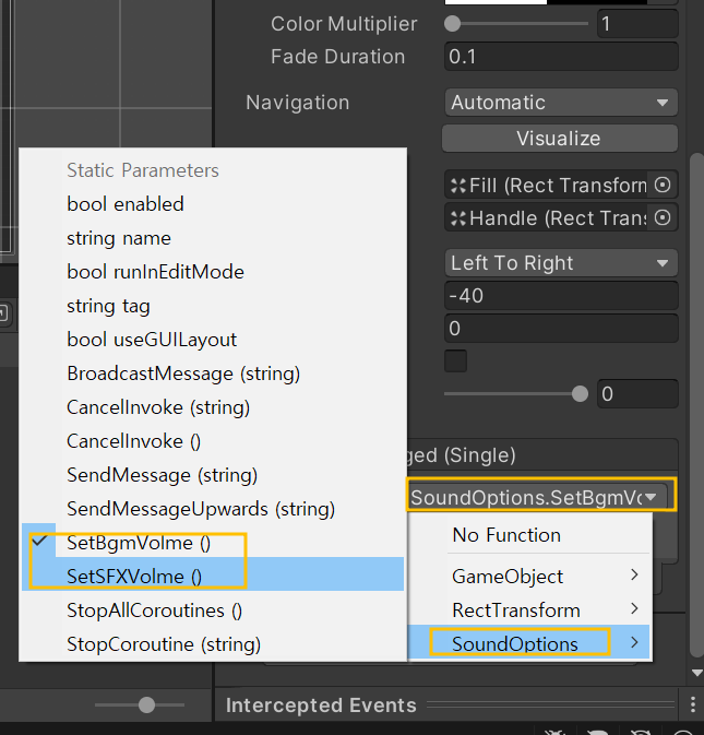 No Funtion > SoundOptions > BGM, SFX에 해당하는 매소드를 선택해준다.