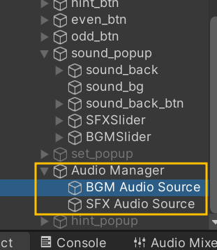 그리고 Canvas에 Create Empty를 만들어 Audio Manager라고 이름을 변경해준다. 그리고 Audio Manager 마우스 우클릭 > Audio > Audio Source를 클릭해, BGM Audio Source와 SFX Audio Source를 만들어준다.