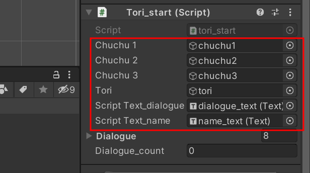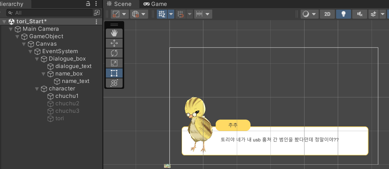 대화글 8개가 다 출력되면 SceneManager.LoadScene(" ")안에 있는 tori_Game_Scene으로 넘어간다.