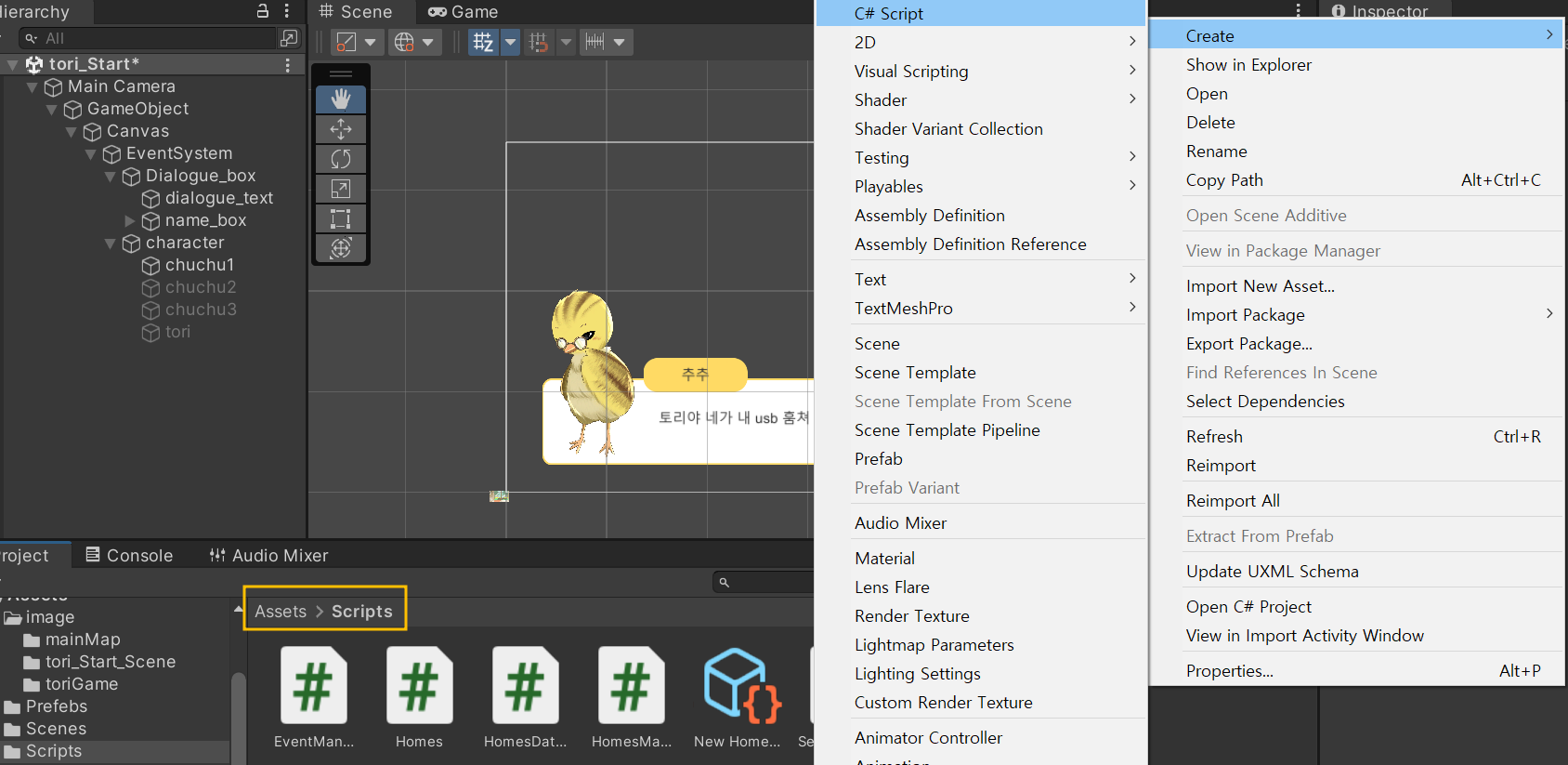 Assets폴더 안의 Scripts 폴더 클릭 후 마우스 우클릭 > Create > C# Script를 클릭해 새 스크립트 생성 후 원하는 이름으로 변경한다.
