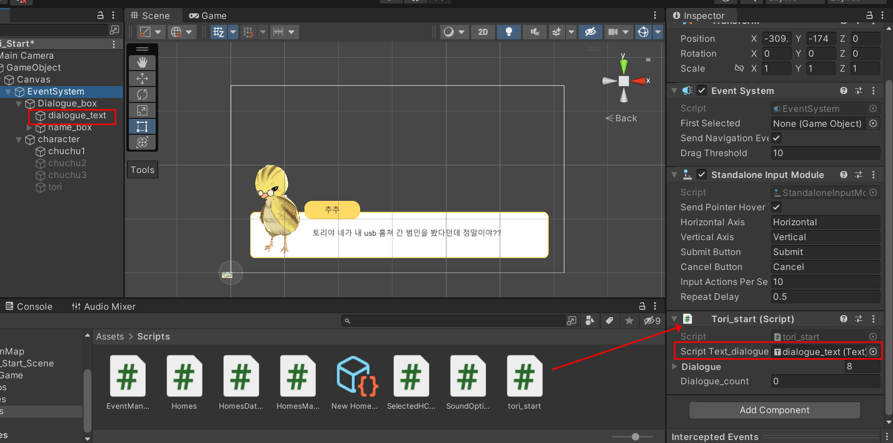 코드를 다 작성했으면 EventSystem의 inspector에 방금 작성한 스크립트를 드래그 해준다. 그리고 Script Text에 변경될 대화를 드래그 해준다.
