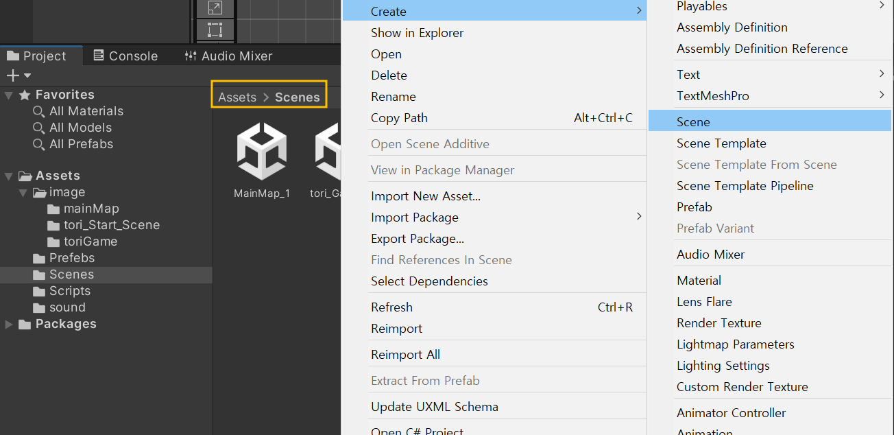 Assets폴더 안의 Scenes폴더에서 마우스 우클릭 > Create > Scene으로 새로운 씬을 생성한 후 원하는 이름으로 변경한다.