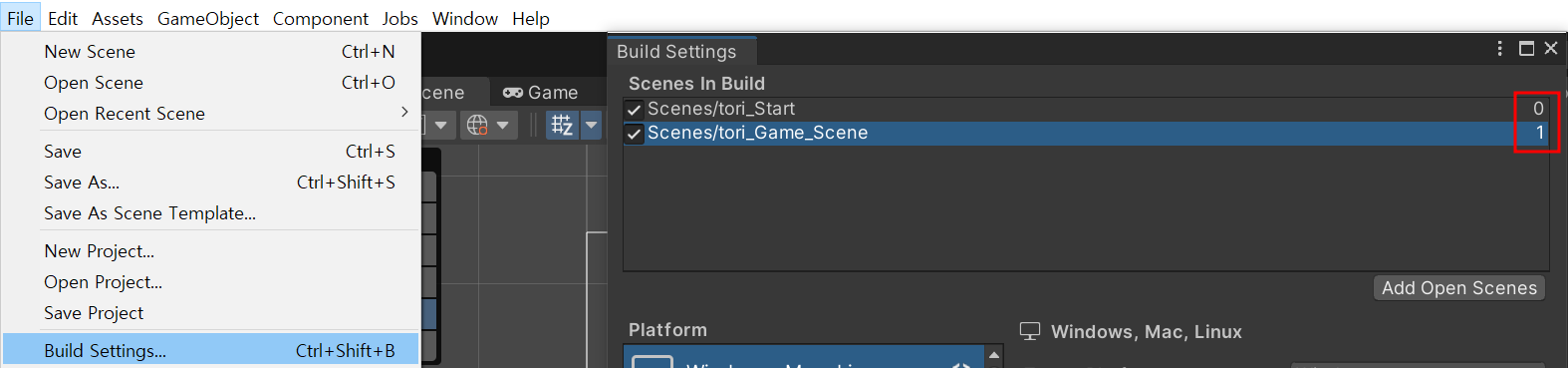 위와 같이 코드를 다 작성했으면 File > Build Settings를 클릭한 후 전환될 씬의 순서를 설정해준다. 전환할 씬이 없는 경우 Scene 폴더에서 Scenes In Build로 드래그 해주면 된다.