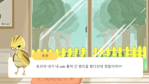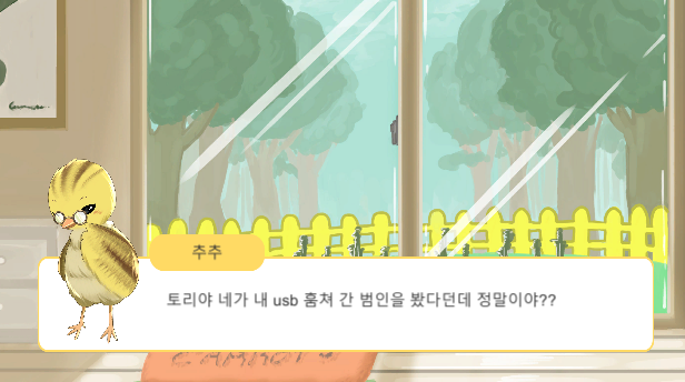 = { "토리야 네가 내 usb 훔쳐 간 범인을 봤다던데 정말이야??",