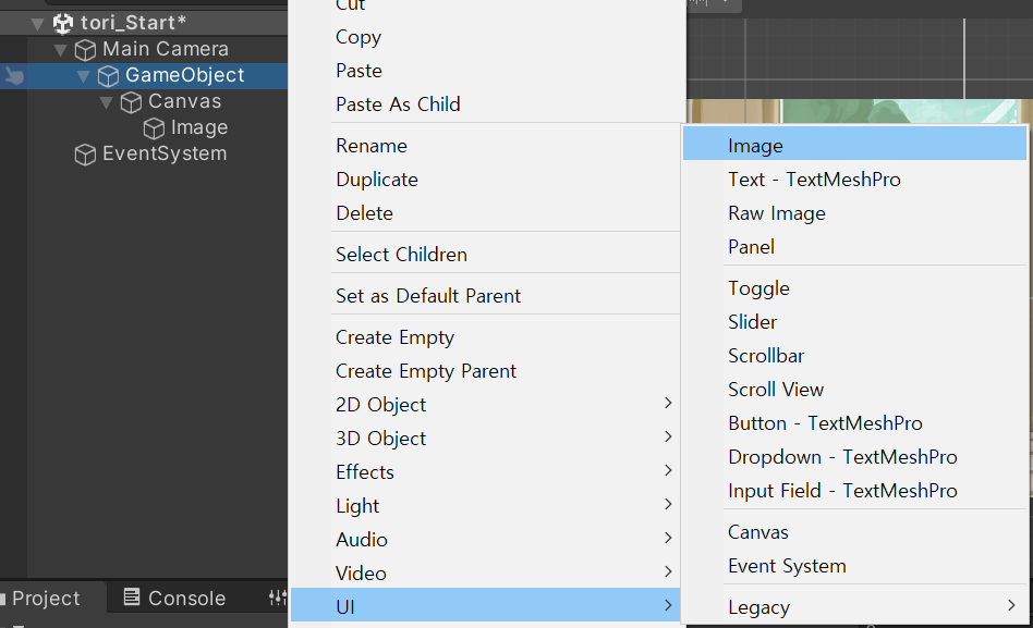 GameObject에서 마우스 우클릭 > UI > Image를 클릭하면 Canvas와 EventSystem이 자동으로 생성된다.