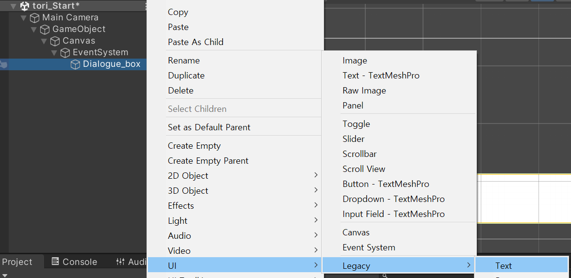 Dialogue_box에서 마우스 우클릭 > UI > Legacy > Text를 클릭하여 대화텍스트 창을 생성해준다.