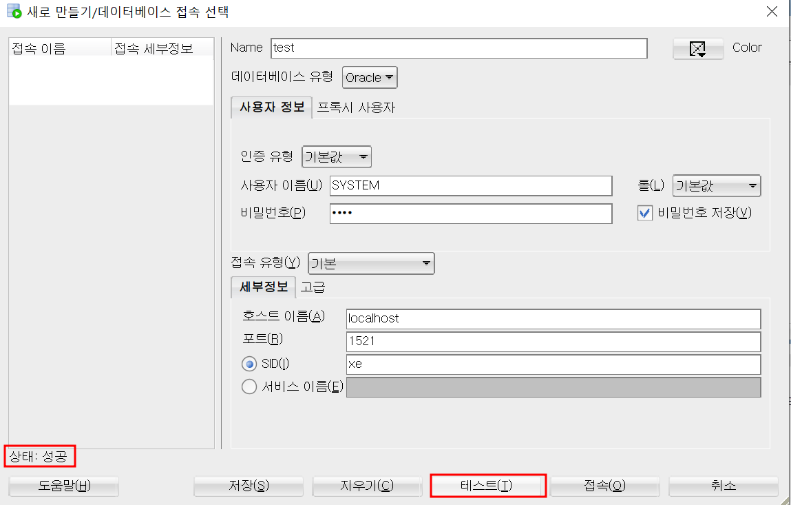 그리고 oracle 기본 사용자이름인 SYSTEM을 적고, 비밀번호는 oracle 설치할 때 적었던 비밀번호를 적는다.