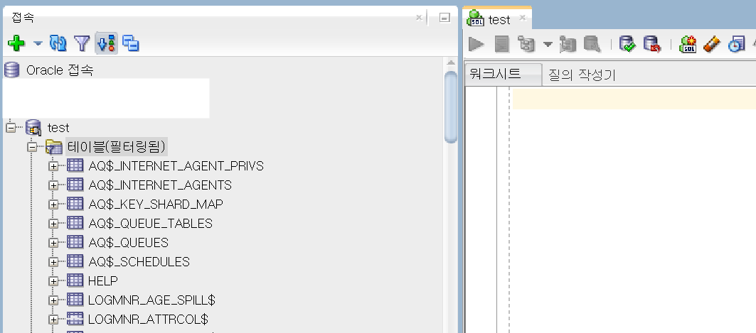 sqldeveloper에 접속하면 아래와 같이 화면이 나오는데 맨 왼쪽의 연두색 +를 클릭한다.