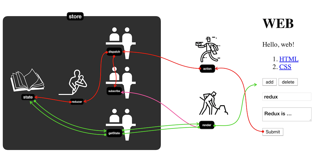 1. store 생성 우리가 redux를 사용하기 위해서 제일 첫 번째를 store를 만들어야 하는 동시에 reducer를 생성해야 했다. 그리고 결과화면 HTML을 클릭했을 때와 CSS를 클릭했을 때 본문의 내용이 잘 바뀌는 것을 볼 수 있다. 그렇다면 배웠던 것을 복습삼아 왜 바뀌는지 생각해보자. 우리는 action을 통해 dispatch에 값을 전달하고 reducer가 state값을 갱신해 dispatch가 subscribe하고 있는 함수들을 호출해주기 때문에 그에 따라 render가 동작해 새로운 state값을 참조하여 UI를 새로 그리기 때문이다. 강의영상 - https://youtu.be/zMTqWoe25aU
